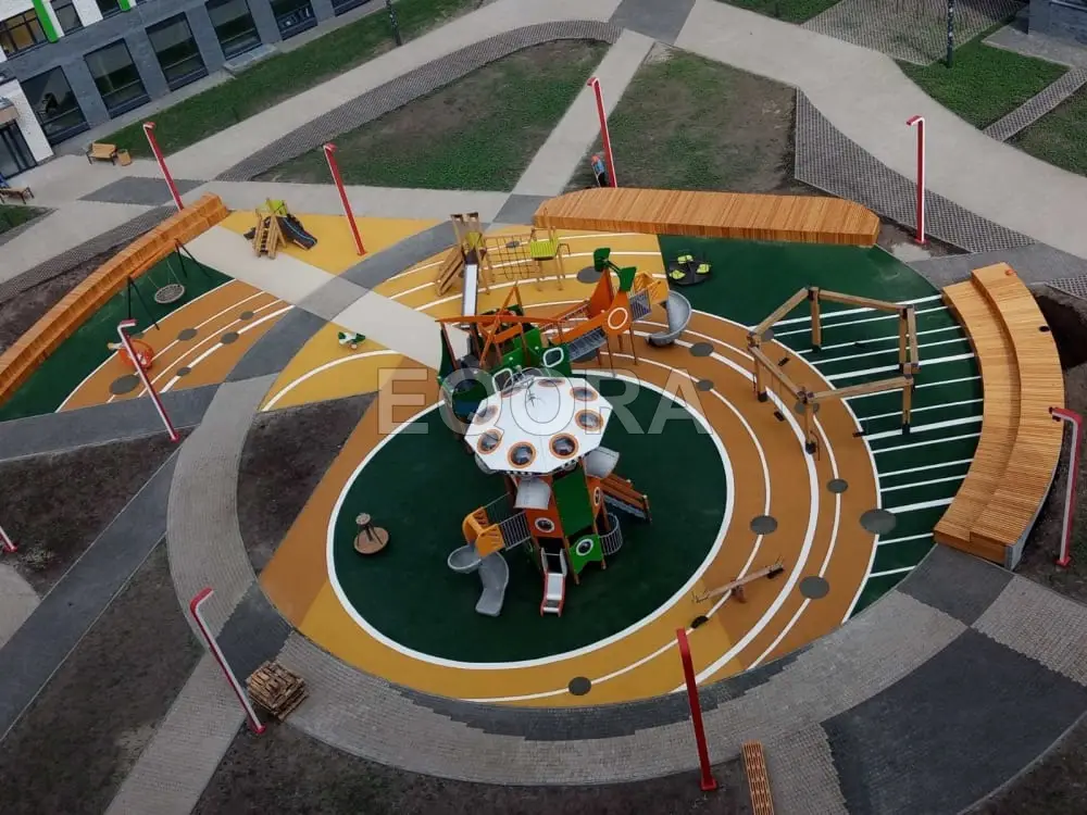 Детская площадка с резиновым покрытием Резинове покрытие в парке Площадка с покрытием из рещзиновой крошки вид сверху Резинове покрытие с EPDM спреем
