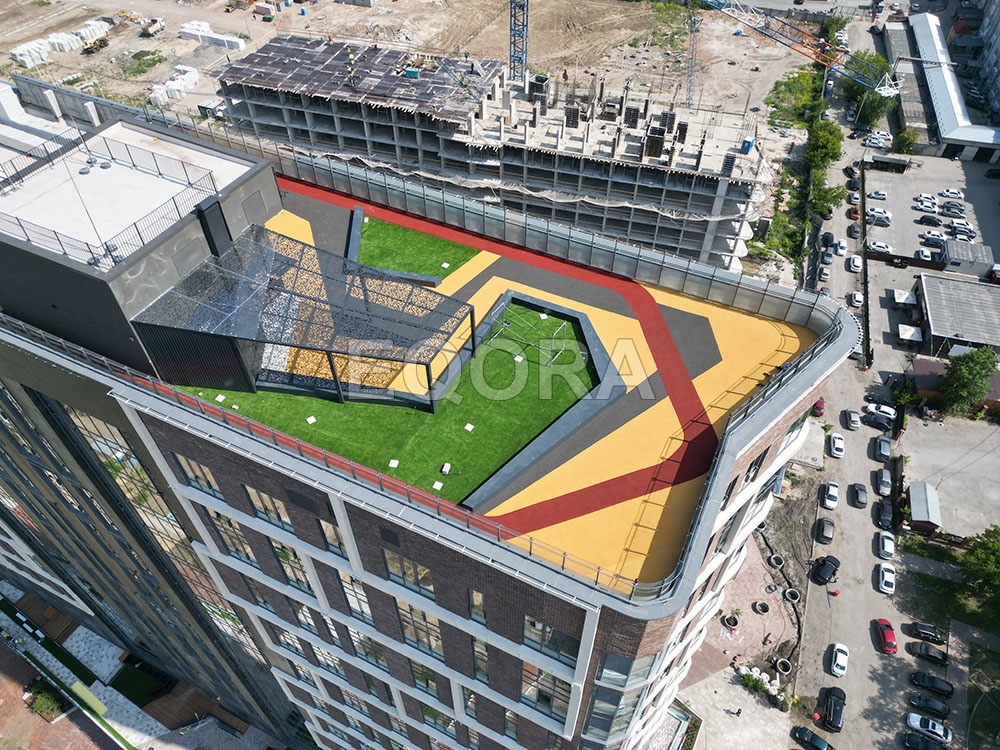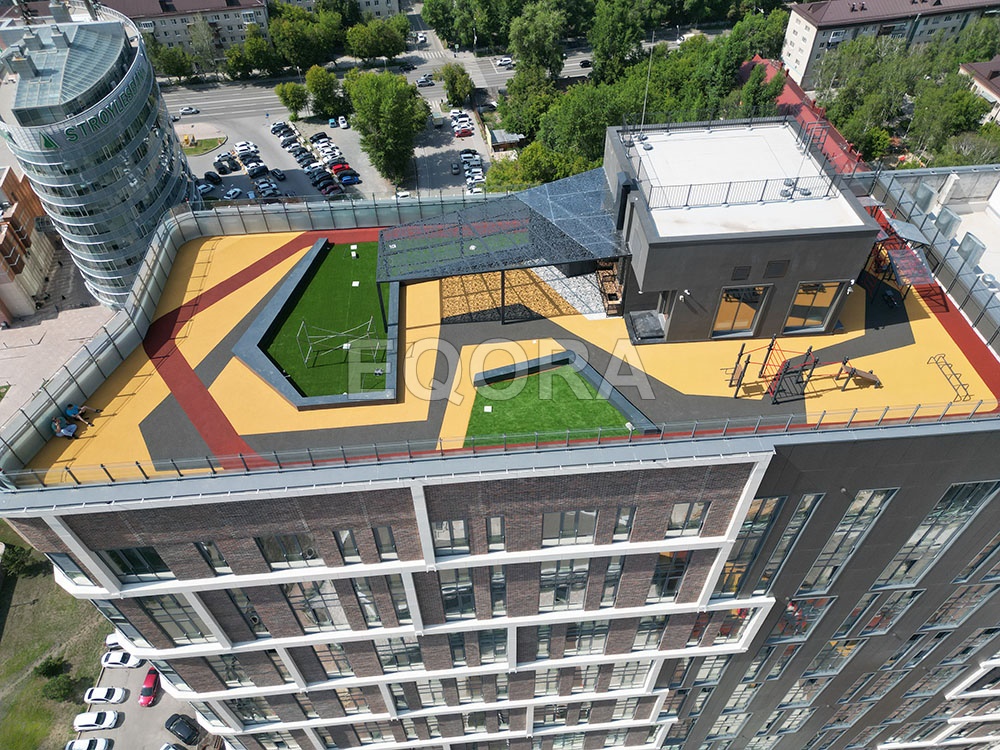 Материал: эластичное травмобезопасное покрытие из резиновой крошки EQORA SBR с амортизирующей подложкой толщина от 20 до 100 мм Объект: ЖК «Машаров» г. Тюмень Площадь: 500 м2