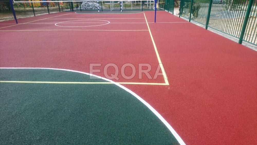 - Нанесение основного слоя: равномерное распределение акрилового покрытия по всей площади площадки.